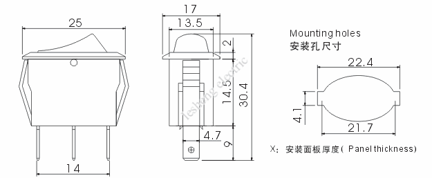 工作參數(shù) Contact Rating: 250VAC,6A 接觸電阻 Contact Resistance: 35mΩ MAX 絕緣電阻 Insulation Resistance: 500VDC,50MΩ 耐壓強(qiáng)度 Dielectric Strength: 1250VAC,1MIN 工作溫度 Operating Temperature: T100 電器壽命 Electrical Life: 10000 Cycles |
